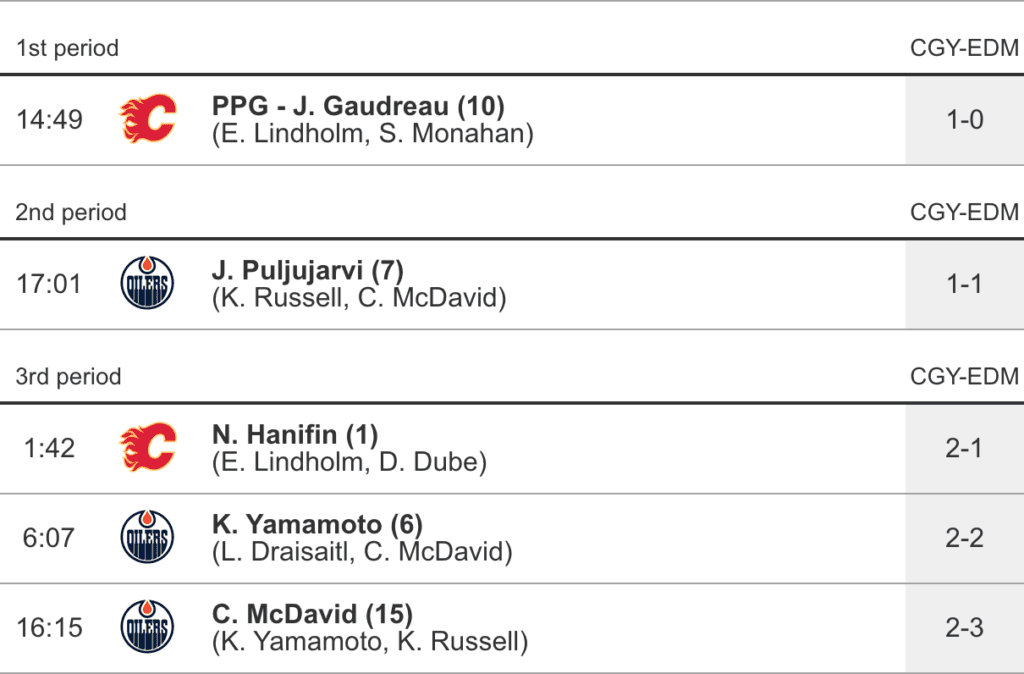 - @Johnny Gaudreau opened the scoring (1-0) with a powerplay goal after he was the business end of a nice passing play in the Oilers zone that gave him the chance to tee off in a shot that Smith wasn’t able to handle.
