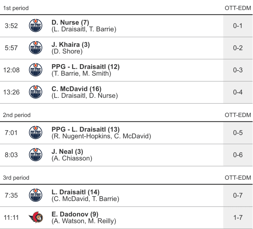 - @Leon Draisaitl added the Oilers’ third goal of the period (3-0) with what can only be described as a finely tuned piece of German engineering. Put another way, Leon Draisaitl took the Sens over his knee and spanked their bums individually before firing a wrister up and over Murray. Draisaitl added another goal in the second period on the powerplay (5-0) after Nugent-Hopkins found him at the side of the net with a filthy little pass from the slot. Draisaitl completed the hat trick (7-0) early in the third period after McDavid left a drop pass for him that left the reigning MVP with a clear look on net that he did not waste.