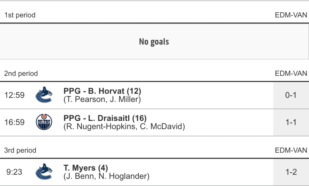 - Seeing as how the Oilers struggled mightily to score on a red hot Demko, they needed their powerplay to come through with a goal and they got one on the four chances they had with the man advantage. Obviously, they needed more than the one goal but it was simply not meant to be and we do still have to appreciate another special teams marker.
