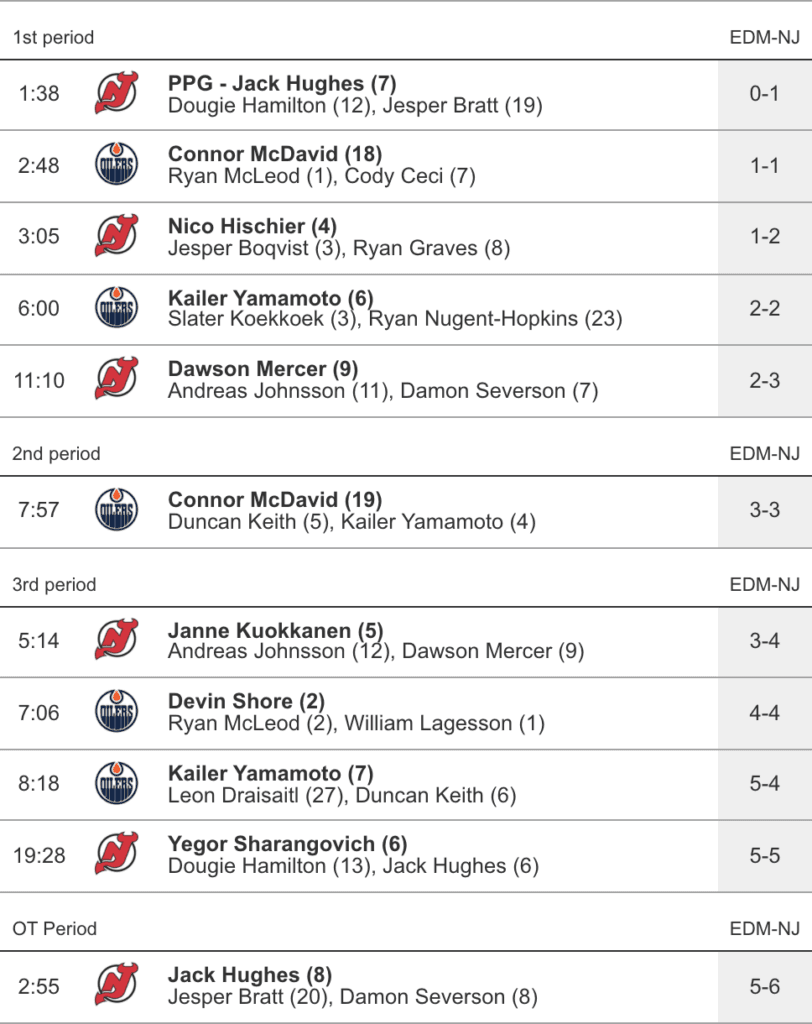 - @Jack Hughes opened the scoring (1-0) with a blast from the boards only 1:38 into the game after the Oilers gound themselves down by a man on what was undoubtedly a weak call, in my opinion. After piling up the chances in the bonus period, Hughes ended up cashing in the winner on an absolute softie that Mike Smith needs to stop every single time. Brutal finish.