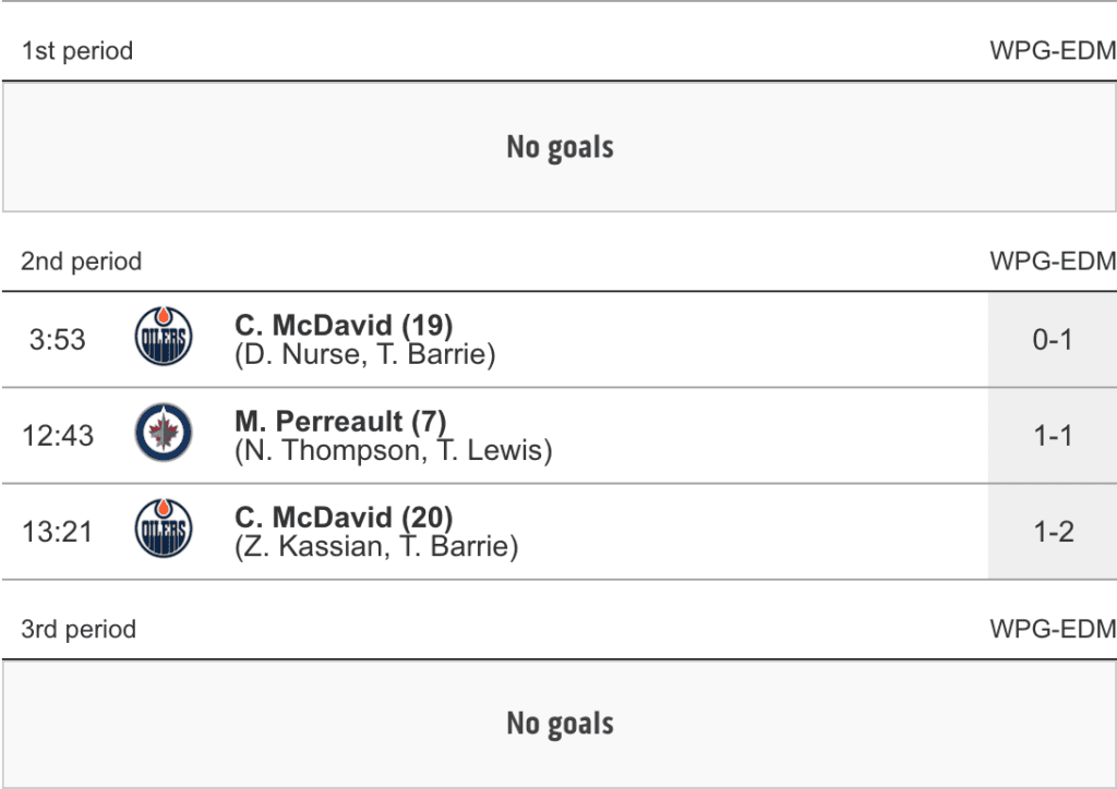 - @Connor McDavid broke the stalemate early in the second period literally five seconds after he jumped onto the ice for his shift after he grabbed the puck near the boards and fired a quick wrister past Brossoit on the blocker side. McDavid added a second marker that was nearly identical just under 10 minutes later, and if you look at the replays of the two goals it’s pretty hilarious to see him zip two shots to the exact same spot.