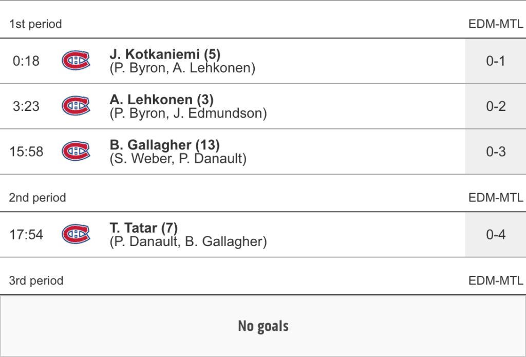 - @Brendan Gallagher added more salt to the wound with Montreal’s third goal of the game (3-0) towards the end of the first period after he outworked a trio of Oilers to knock a loose puck in the crease into the empty net. Honestly, it’s hard to accurately describe