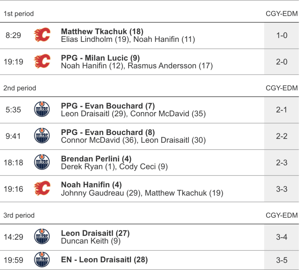 - @Evan Bouchard got the Oilers on the board (2-1) with a power play goal after he bombed a shot from the point that make its way through traffic and past Markstrom on the glove side. Bouchard added a second power play goal (2-2) only four minutes later as he, once again, found a way to get a puck through traffic that Markstrom couldn’t see until it was already past him.