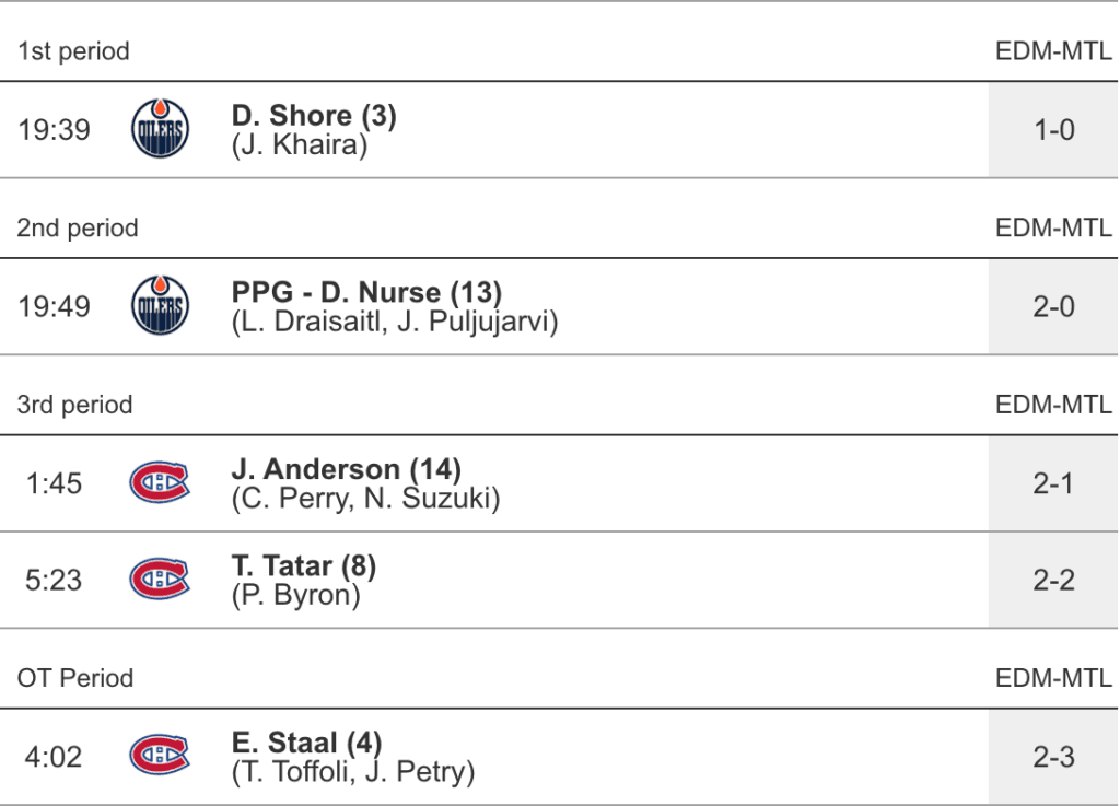 - @Eric Staal completed the comeback with an OT winner from his offwing that beat Smith down low. Frankly, I’m still a little bit surprised by how off McDavid and Draisaitl looked in the bonus period as neither of them seemed as sharp as we’ve come to expect.