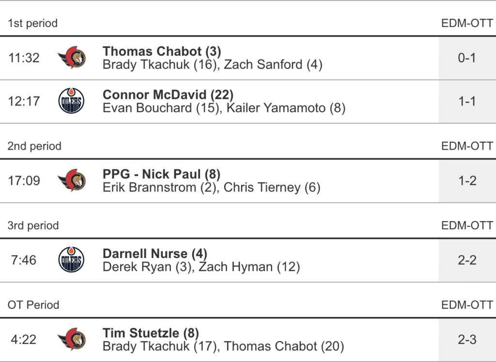 In the bonus period, the Oilers looked gassed and sloppy as they were repeatedly passing to no one in particular which gave the Senators plenty of attack time to try and make something happen. Even though Edmonton had a few looks of their own, their inability to create with confidence proved costly as it was the turnovers that ultimately sunk the ship. I mean, I don’t know that I’ve seen the Oilers look so disjointed in OT before, and it was rough to watch them struggle to put anything together until the Sens were finally able to close it out.