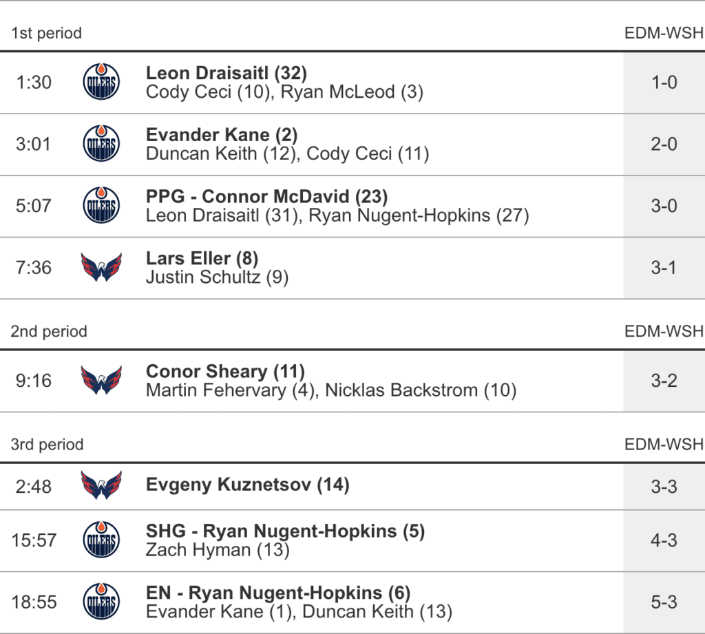 - Only 90 seconds into the game, @Leon Draisaitl opened the scoring (1-0) with a beautiful little chip up and over Samsonov after he and Cody Ceci perfectly executed a give-and-go that seemed to catch the Caps off guard.