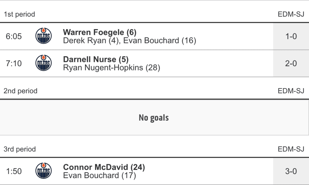Only 65 seconds after Foegele got the Oilers’ opener, @Derek Ryan put the boys up by a pair (2-0) after he too was able to deflect a point shot — this time by Darnell Nurse — past Jame Reimer and into the back of the net.As I was just finishing up the article for the night, I noticed that the NHL had Darnell Nurse scoring this goal, which meant that his point shot bounced in off a San Jose defenceman even though the first look appeared as though it was Derek Ryan that got it.- Early in the third period, @Connor McDavid added some insurance (3-0) with a quick snap through the five-hole after a hardworking shift by his line that left the Sharks scrambling in their own end like the Eakins-era Oilers.
