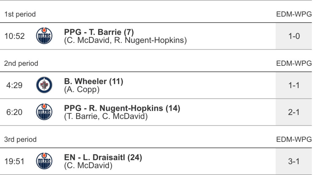 - @Tyson Barrie opened the scoring (1-0) on the powerplay with a huge blast from the point that made its way through traffic and up over Hellebuyck’s blocker. Quite frankly, I don’t know how you’d expect anyone to stop that puck because Barrie absolutely got a hold of that thing after McDavid set him up on a tee.