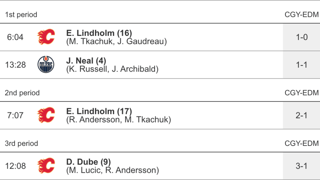 - @Elias Lindholm opened the scoring (1-0) after the Oilers (Russell specifically) bungled their breakout to the point of gifting the Flames with a clear look on net. By my count, there were at least three errors on the play before Lindholm was eventually able to rip a shot past Smith. Lindholm added a second goal (2-1) midway through the second period by being in the right spot at the right time as the point shot from Rasmus Andersson bounced in off his shinpad.