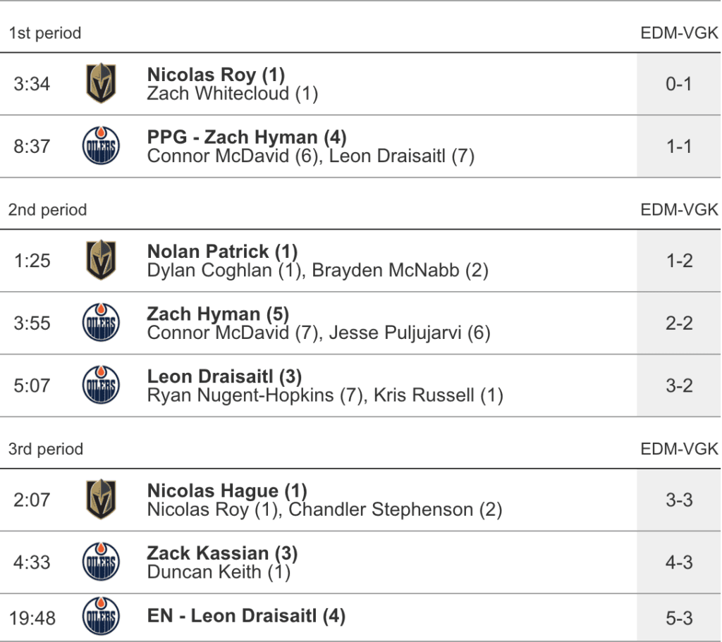 - Nicolas Roy opened the scoring for Vegas (1-0) with a perfectly placed deflection from the slot after he got his stick on Whitecloud’s shot from the point. The Oilers were scrambling around in their own zone early and it almost wasn’t surprising that Vegas was able to take advantage of the general sloppiness.