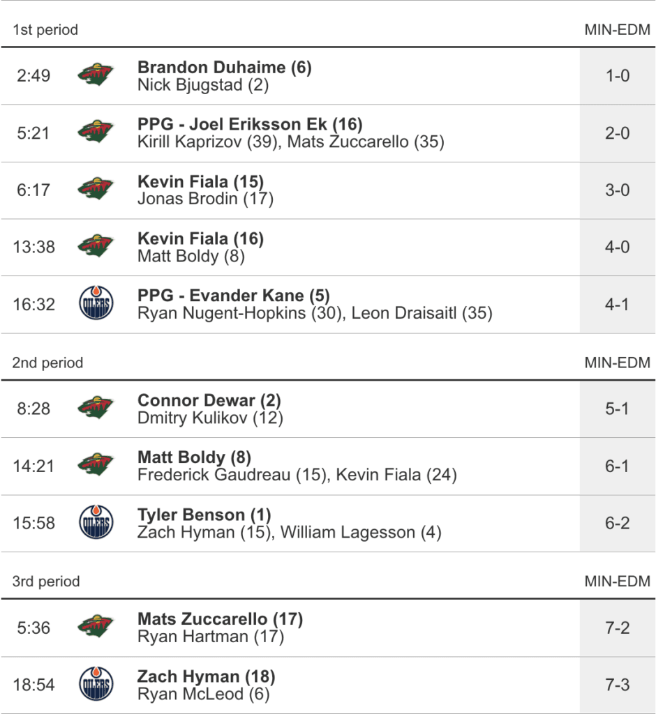 - Matthew Boldy tacked on Minnesota’s sixth goal of the game (6-1) after pulling off a nifty little backhanded toe drag around the Oilers defended in the high slot and ripping wrist through Koskinen down low.