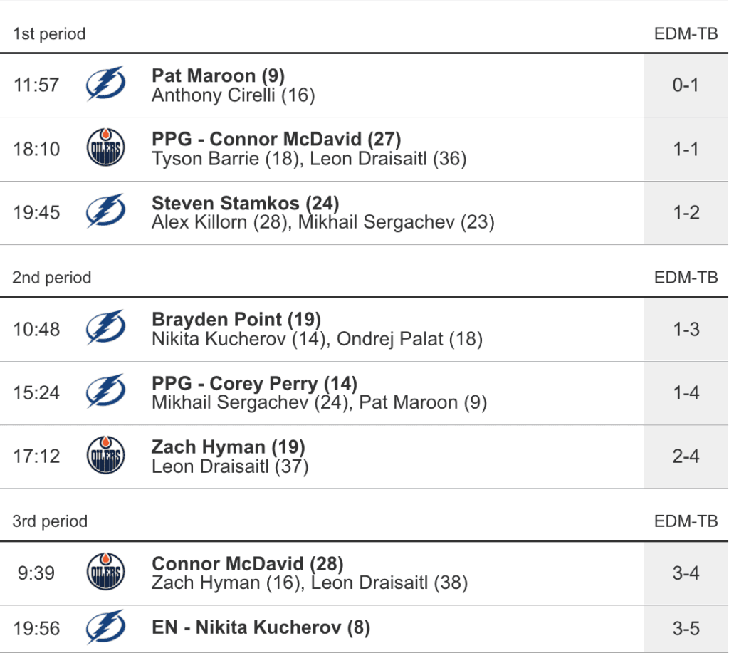 - @Connor McDavid tied the game at one apiece (1-1) with a power play goal after he snapped a low wrister that buzzed by Vasilevskiy low on the blocker side. McDavid scored a second time midway through the third period (4-3) to pull his team to within one after he fired a sexy wrister to the glove side that was made possible when Hyman found him flying through the high slot with speed.