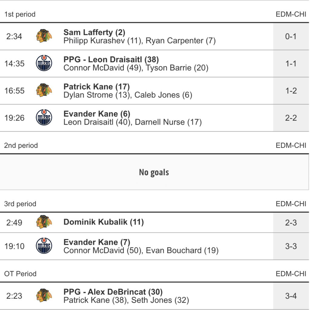 - @Patrick Kane restored Chicago’s lead (2-1) after a lost board battle near the hash marks prevented the Oilers from clearing the zone, which turned the puck around and gave the Blackhawks an odd-man opportunity down low.