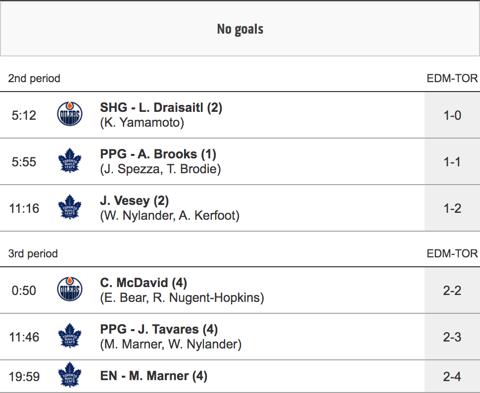 - @Jimmy Vesey gave the Leafs the lead (2-1) after being the business end of a beautiful passing play in the slot that saw the puck tic-tac-toe around the Oilers’ zone quickly and deliberately. The play never should have happened in the first place, but Adam Larsson duffed his clearing attempt and gave the Leafs the additional zone time they needed to convert.