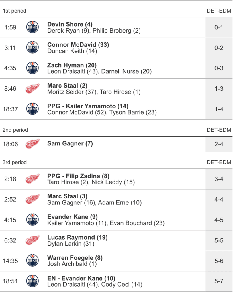 - @Kailer Yamamoto threw a handful of sand in Detroit’s eyes with a power play goal (4-1) in the dying moments of the first period after parking himself in front of the net with his stick on the ice, perfectly deflecting McDavid’s centering pass to the top of the crease. This goal marked Yamamoto’s third in as many games as he continues to heat up down the stretch.