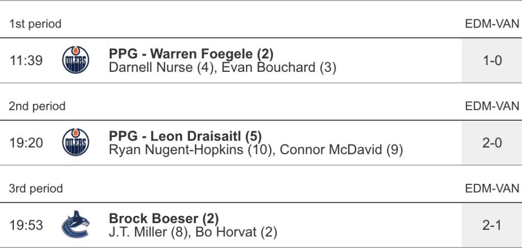 - Leon Draisaitl extended the Oilers lead (2-0) with another power play goal near the end of the second period after Nugent-Hopkins set him up for a one-timer from his office along the boards that beat Demko cleanly.