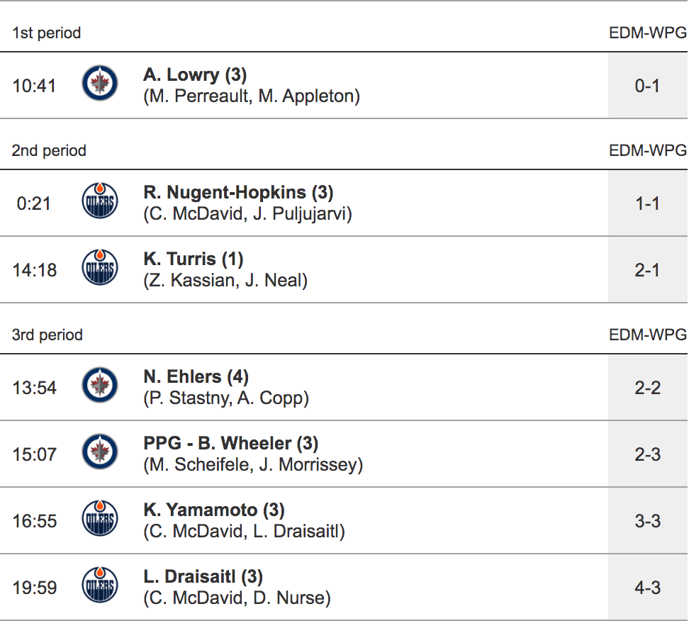 - @Adam Lowry opened the scoring for Winnipeg (1-0) after his line successfully battled for a loose puck down low in the Oilers zone and fed it out front to the slot where the eventual goal scorer was waiting. Edmonton’s inability to clear the puck from behind their own goal line has been a real problem so far and that was the case again on Lowry’s goal.