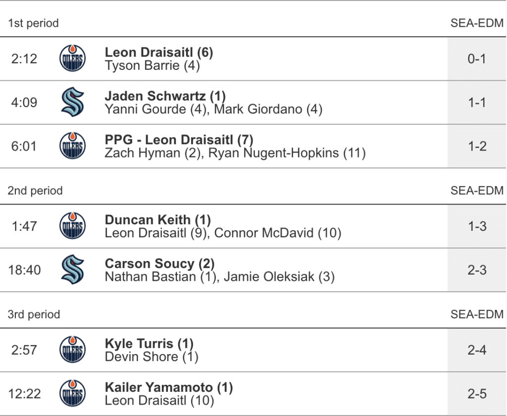 - Carson Soucy pulled the Kraken back to within a single goal (3-2) after he picked up a pass high in the slot as the trailing man on the play and roofed a wrister up and over Koskinen’s blocker. To that point, the Oilers were looking incredibly sloppy and it was not at all surprising to see Seattle close the gap before the period ended.