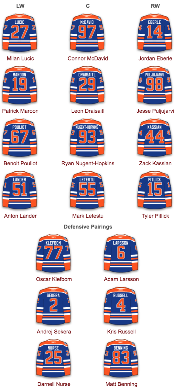 NOT-SO-OBVIOUS GAME DAY PREDICTION: An Oilers D-man not named Nurse scores a goal. He’s the only one with a goal thus far, but Klefbom scores tonight to give Nurse some company among blueliners with goals.