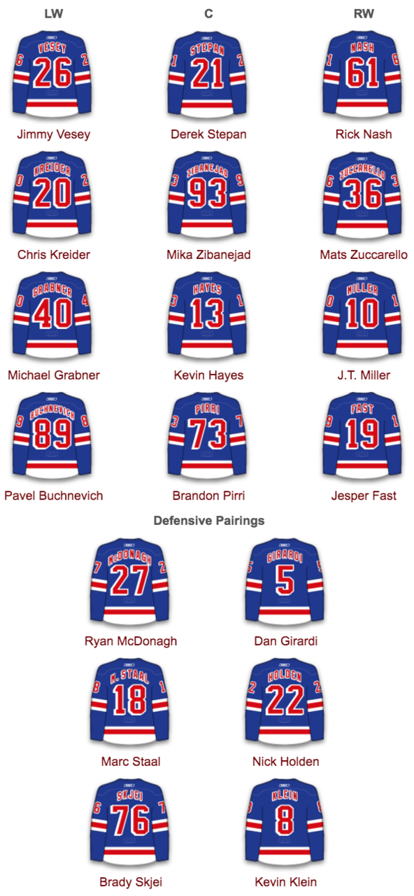 The Rangers return to action Thursday against old friend Cam Talbot and the Edmonton Oilers. The Oilers lead the Pacific Division with a 7-2-1 record, though they have hit an mild slump the past two games. That strong start has been keyed by Talbot and of course, Connor McDavid, who leads the league in scoring. New York is in the midst of five games in eight nights, having won the first two with a back-to-back looming this weekend.The lineup tonight for New York will be the same as it was Tuesday night. That means Oscar Lindberg will be a healthy scratch again up front while Adam Clendening sits for the sixth straight contest. Look for Clendening to probably play one of the two games this weekend. As I mentioned yesterday, I would sit one of G, Staal or quote likely Klein to get Clendening in the lineup.