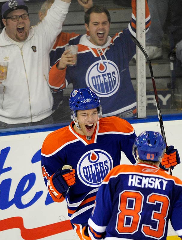 Taylor Hall and Ales Hemsky along with every Oiler fan, is hoping this type of celebration will be a regular occurance, starting tonight. If the Oilers are going to be in the playoff hunt come March then Hemsky and Hall will need to be the offensive leaders. Putting them together means they, along with Nugent-Hopkins, will usually face the opposition’s best defenders, so a part of me wonder if Tom Renney will split them up at some point to free up one of them.