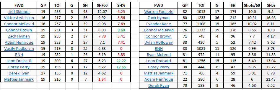 Only Leon Draisaitl, Corey Perry and Connor Brown have a better Sh% so far this season than last. But Zach Hyman is the only player who has a significant dip or increase in shots/60. He is down almost three. He isn’t getting as many chances around the net, but his SH% is where we see the biggest dip. He was at 16.98% last year but only 5.31% this season. He has two goals but would need six to be at 16%. Last year was a career high in 5×5 goals and SH%, but he also had more shots on goal. His career SH% at 5×5 is 10.9%, and in his three previous seasons in Edmonton it was 12.2%. He’s well below that. He’s had some bad luck, but he also on pace for only 159 shots which is lower than the 212 and 193 he had the past two years.