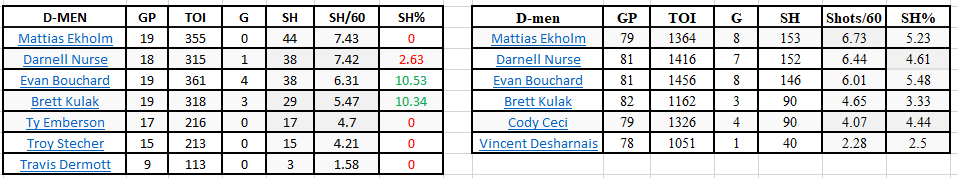 Evan Bouchard and Brett Kulak are scoring at a much higher rate early on, while Mattias Ekholm and Darnell Nurse’s goals and SH% are down. Goals by D-men can fluctuate, but overall, the group is scoring around the same number of goals. The shot rate from the blueliners has increased, but more shots from the blue line doesn’t lead to more goals. Last year they averaged 8.25 shots/game from the blue line, while this season they are at 9.68. A small increase, but not enough to impact the overall team SH%.