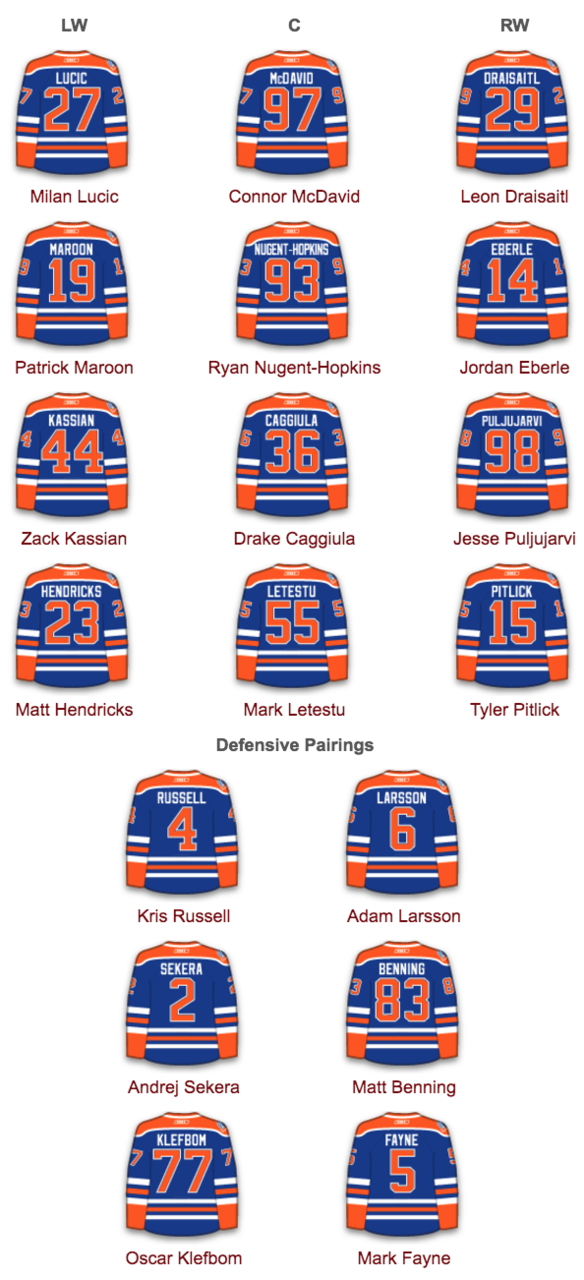 Matt Hendricks and Jesse Puljujarvi draw back in while Benoit Pouliot and Anton Slepyshev are out. The bottom three lines are all different from last game, as Maroon moves up to the second line, while Kassian will play with Caggiula and Puljujarvi.