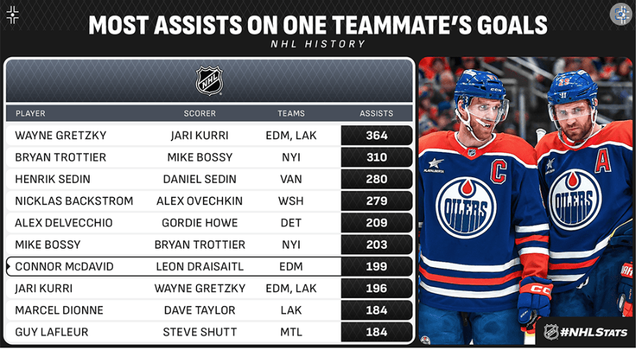 — Connor McDavid is one assist shy of becoming the seventh player to have 200 assists on one teammate’s goals. He’s assisted on 199 of Leon Draisaitl’s 367 career goals thus far.