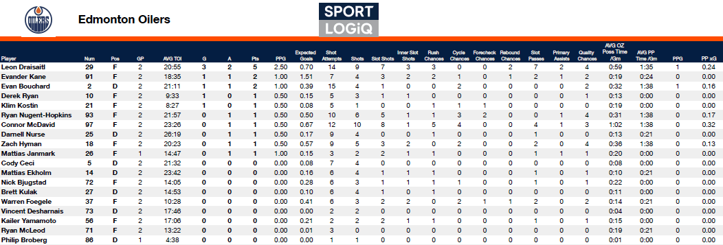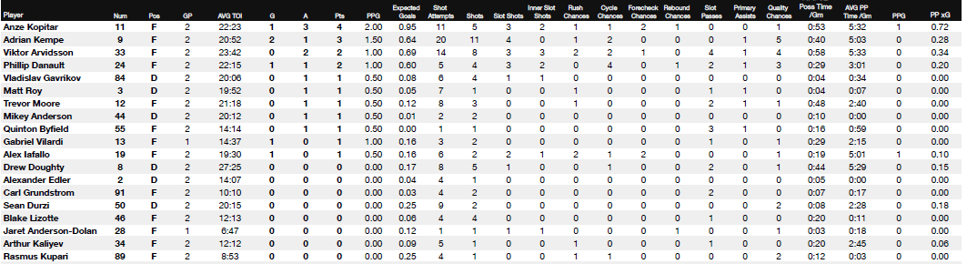 The Oilers should be thrilled with their defensive play through two games. LA has only had a total of 10 shots from the inner slot for an average of five/game. As mentioned above, LA led the NHL with 5.3 during the regular season.