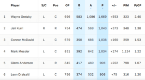 – McDavid is now third on the Oilers’ all-time scoring list with 1,036 points. He will pass Jari Kurri for second in the next 10 days. Meanwhile Draisaitl needs one point to pass Glenn Anderson for fifth with 907 points. Draisaitl needs 127 points in his next 94 games to pass Messier and have more points in fewer games played. Draisaitl will be in third place at some point next season. I strongly believe McDavid will sign a new contract next summer with the Oilers and during that contract he will pass Wayne Gretzky on the Oilers all-time scoring list. Draisaitl is on pace to finish this season with 974 career points. He’d need to score 675 points (an average of 84 points per season) during his eight-year extension to pass Gretzky. It is possible.