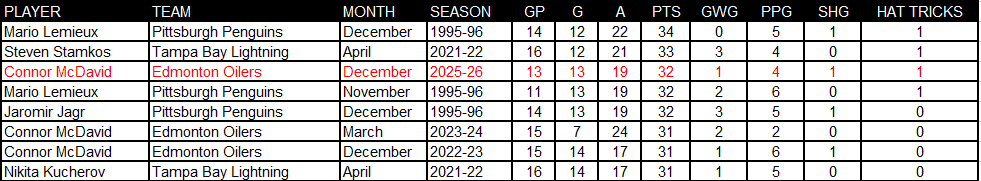 — McDavid needs three points in his final two games of December to become the first player since 1995 to score 35+ points in one month. Here are the best months since 1996: