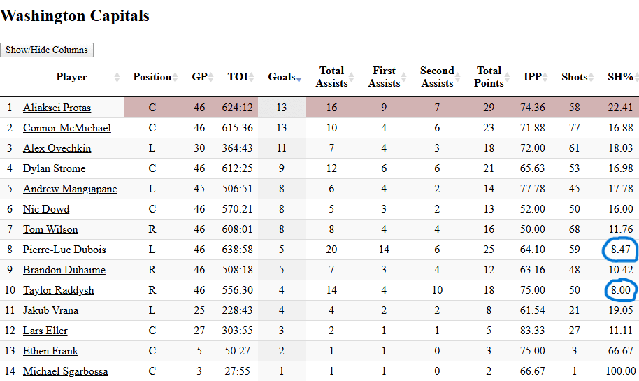 Washington has two forwards under a 10SH%, while the Oilers have seven in tonight’s lineup. The Capitals have eight forwards at 16SH% or higher and the Oilers have two.