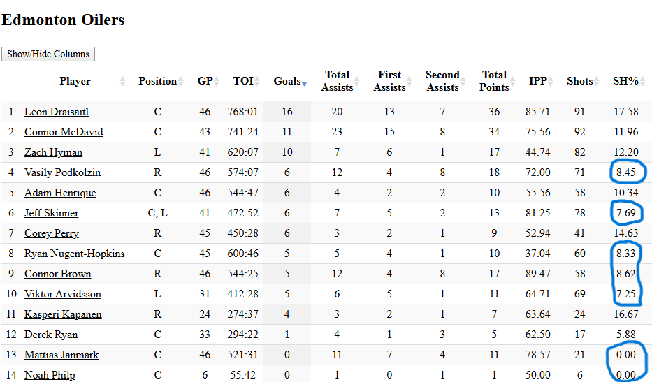 Edmonton is 5th in GF with 100. They rank first in shots for and 1st in SF/60. They are 25th in SH% at 8.32.