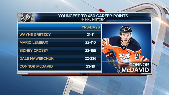 #Oilers Connor McDavid becomes the 5th youngest player in NHL history to record 450 points