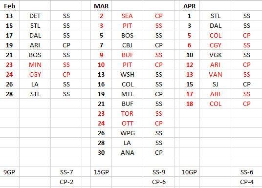 Calvin Pickard will get the start, and that makes sense. He needs to start six games this month to keep Skinner on pace for 57 starts. I wrote about goalie starts in February and this was my projection chart at the time.