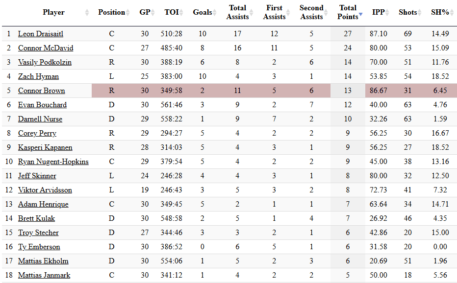 In the 30 games from November 21st to January 28th, the Oilers went 22-7-1. Stuart Skinner was 13-6-1 with a .914Sv% and 2.38 GAA. Calvin Pickard was 9-1 with a .905sv% and 2.49 GAA. When both goalies have a GAA under 2.50 they are doing their jobs. The team defense overall was good, although they did rank 27th in odd-man rushes against 5×5 and 24th in high-danger chances off the rush against. Their 5×5 play was solid and they had decent contributions throughout the lineup.