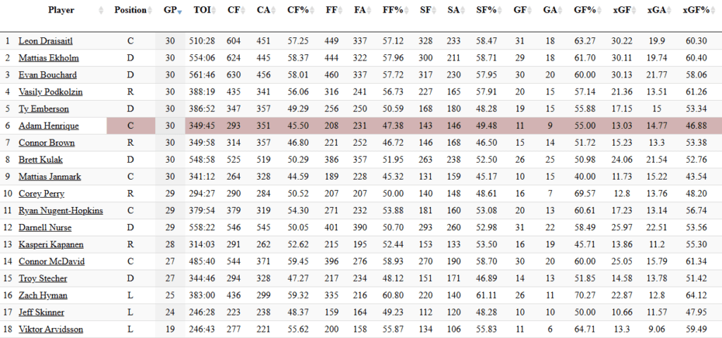 — But since then, it has been ugly for the Oilers — and really ugly the past 11 games. Only three players (Corey Perry, Jeff Skinner and John Klingberg) have a GF% above 50%. And before you put all the blame on the goalies during this stretch, the team’s expected goals against at 5×5 was 26. You don’t win many games with 2.36 xGA solely at 5×5. Edmonton was at 1.91 during the previous 30 games and the goalies allowed fewer goals (57) than the expected formula said they should (58). Edmonton has been very leaky defensively lately. They’ve had too many ghastly turnovers. They will be better though. They have shown they can play solid defense for long stretches, and this team has the skill to play well again.