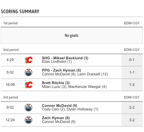 zach hyman can't stop scoring goals. he gives the oilers 3-2 lead as connor mcdavid gets his third point of the night.