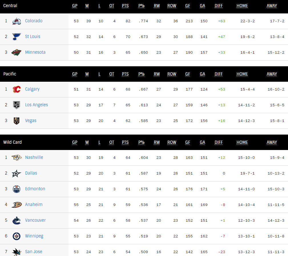 We will see 75 games involving the 11 teams in the mix. I do think Calgary and Minnesota are in good spots, but included them because they have so many head-to-head games against the other teams.