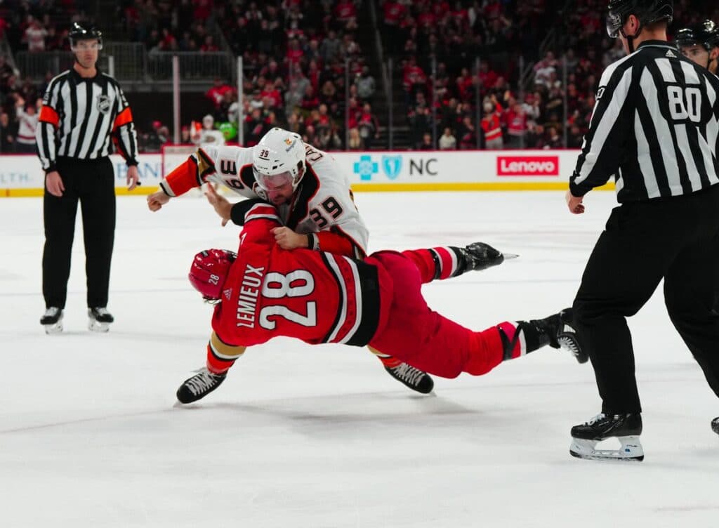 Jan 11, 2024; Raleigh, North Carolina, USA; Carolina Hurricanes left wing Brendan Lemieux (28) and Anaheim Ducks center Sam Carrick (39) fight during the second period at PNC Arena. Mandatory Credit: James Guillory-USA TODAY Sports