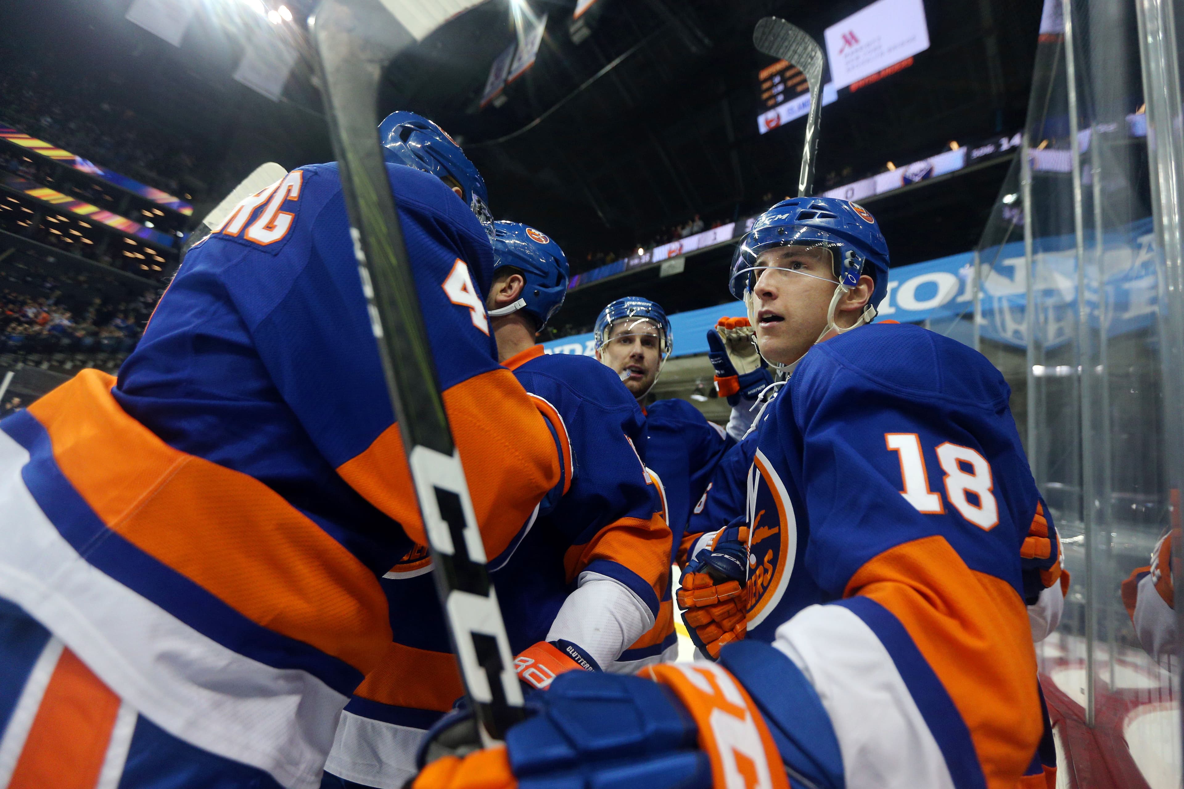 Dec 23, 2016; Brooklyn, NY, USA; New York Islanders center Ryan Strome (18) celebrates his goal against the Buffalo Sabres with teammates during the second period at Barclays Center. Mandatory Credit: Brad Penner-USA TODAY Sports