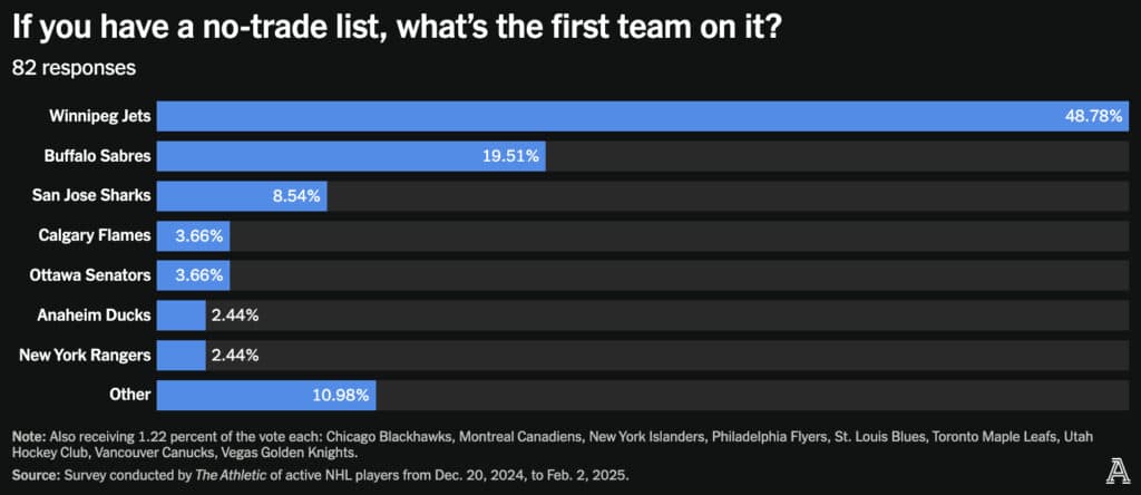 In fact, 48.78 percent — or 40 of the 82 — chose the Winnipeg Jets as the No. 1 team on their list, followed by the Buffalo Sabres (19.51 percent), and the San Jose Sharks (8.54 percent). The Calgary Flames, Ottawa Senators, Anaheim Ducks, New York Rangers, Chicago Blackhawks, Montreal Canadiens, New York Islanders, Philadelphia Flyers, St. Louis Blues, Toronto Maple Leafs, Utah Hockey Club, Vancouver Canucks and Vegas Golden Knights all received at least one vote.