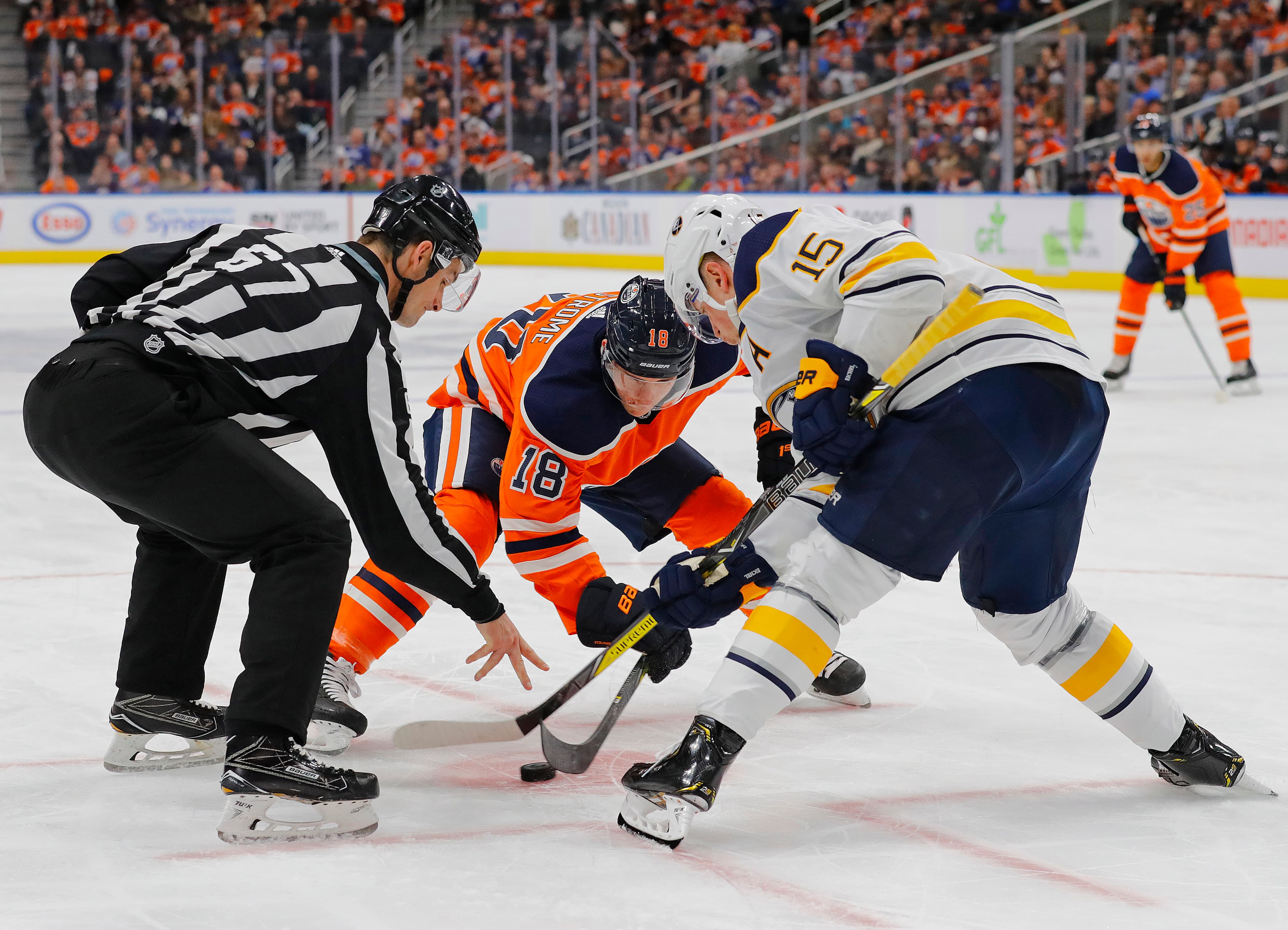 Jan 23, 2018; Edmonton, Alberta, CAN; Buffalo Sabres forward Jack Eichel (15) wins a face-off against Edmonton Oilers forward Ryan Strome (18) during the third period at Rogers Place. Mandatory Credit: Perry Nelson-USA TODAY Sports