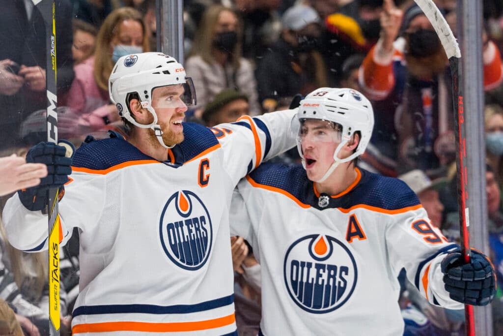 Jan 25, 2022; Vancouver, British Columbia, CAN; Edmonton Oilers forward Connor McDavid (97) and forward Ryan Nugent-Hopkins (93) celebrate McDavid’s game winning goal against the Vancouver Canucks at Rogers Arena. Oilers won 3-2 in Overtime.