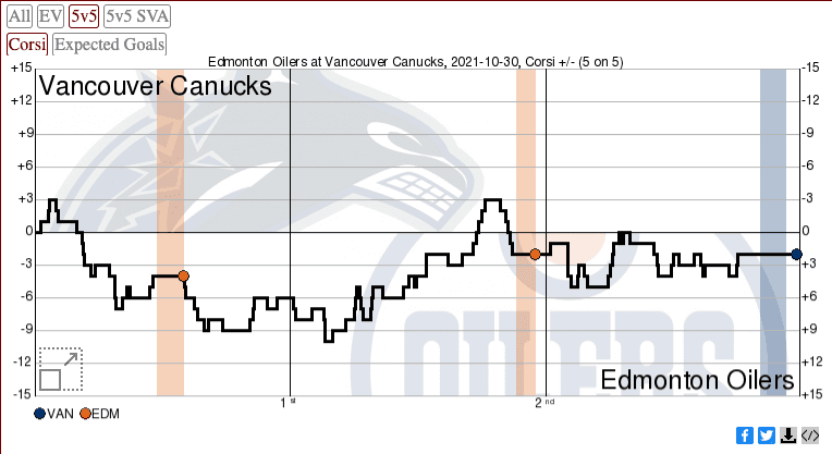 In 14:22 with this trio on the ice at even-strength, Vancouver outshot the Oilers 14-to-6 and had nine scoring chances to Edmonton’s two. The first and third lines were both good, but the Oilers need to find a way to get the second line going. Yamamoto doesn’t have a point through seven games this season.
