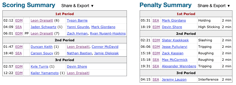 Tyson Barrie fired a pass from Edmonton’s goal line to Ryan Nugent-Hopkins, who was waiting just outside of Seattle’s zone. From there, Nugent-Hopkins sauced a pass to Zach Hyman, who was busting towards the net. Hyman then hit Leon Draisaitl, who had burned past Adam Larsson, for a backdoor tap-in. That’s three perfect passes in the span of about six seconds that resulted in a gorgeous goal.