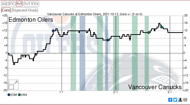 They had a big first period, firing 25 shots towards Demko while the Canucks had 16. Things balanced out the rest of the way, as the teams went 11 and 11 in the second and the Oilers edged out the Canucks in the third 14 to 12. Where you can really see Edmonton’s five-on-five dominance, though, is in terms of scoring chances, as the Oilers had 28 all told and the Canucks had 17.