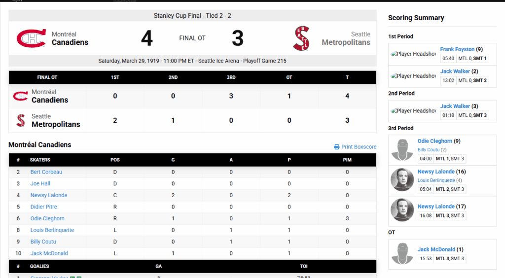 The last team to do that was the Montreal Canadiens in 1919 against the Seattle Metropolitans. Seattle was technically a non-NHL team, and the game isn’t even listed at NHL.com, but here is the game sheet.