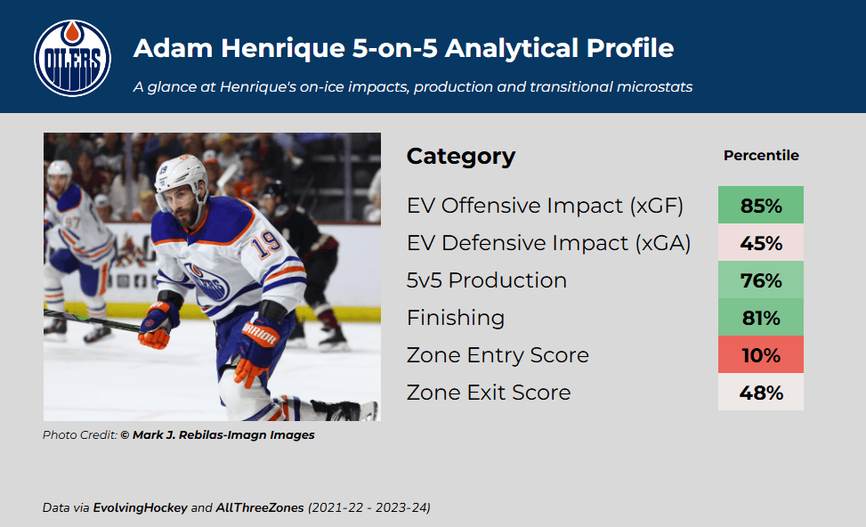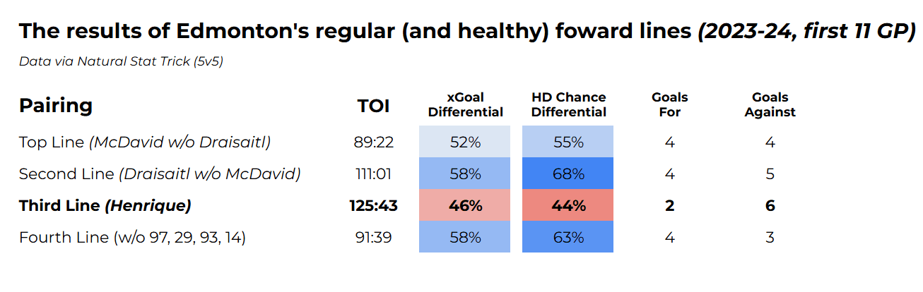 It’s also worth noting that Henrique’s underlying defensive numbers are rather unspectacular. Ryan McLeod was flawed as Edmonton’s 3C in several ways, but at the very least, he remained an excellent defensive center who could drive possession when he wasn’t scoring. The problem with Henrique right now is that when he isn’t producing goals, he’s much less useful.